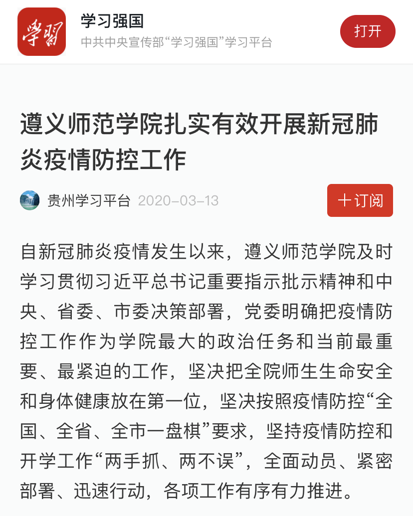 注重对外宣传联络,立体展示遵师形象。加强与各级主流媒体对接,在“学习强国”学习平台、《贵州日报》、贵州广播电视台客户端“动静贵州”、多彩贵州网、《遵义日报》等主流媒体平台持续发出遵师声音,策划撰写了《beat365亚洲版官网扎实有效开展新冠肺炎疫情防控工作》《beat365亚洲版官网:疫情防控不放松线上开学不延迟》《防疫控疫遵师人在行动》《beat365亚洲版官网“三个强化”做好新型冠状病毒感染的肺炎疫情防控工作》等专题报道,引发社会多方关注。已在校外媒体刊播发有关我院疫情防控工作的新闻40余条。其中,《“三个强化”做好新冠肺炎疫情防控工作》在人民网主办“网络舆情”公众号“疫情防控联播“专栏上作为地方经验予以宣传报道;公益歌曲《仁心永恒》MV先后获遵义广播电视台、“多彩贵州网”、“学习强国”学习平台推送,并入选全国校园抗击疫情主题原创歌曲MV展播。