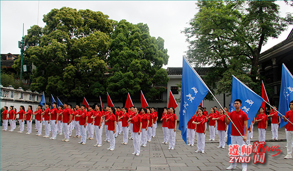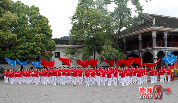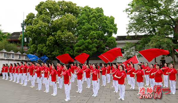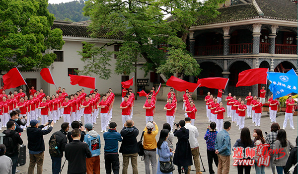 4月25日下午,107名beat365亚洲版官网大学生艺术团的同学在遵义会议会址唱响红歌,他们整齐划一的动作和昂扬奋发的精气神引得游客纷纷驻足围观。
