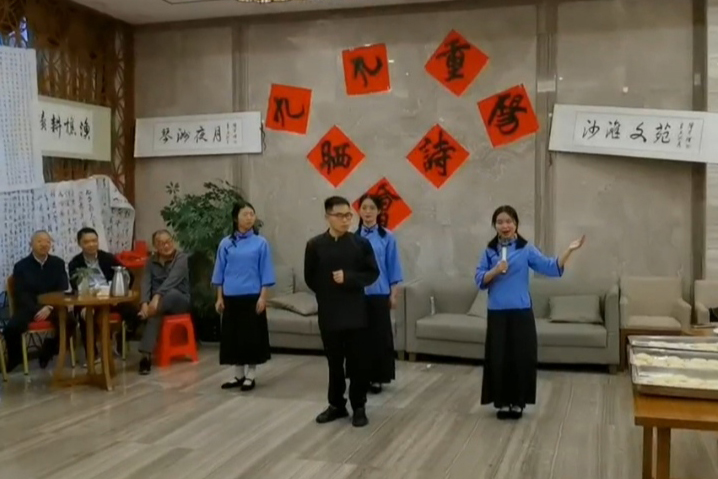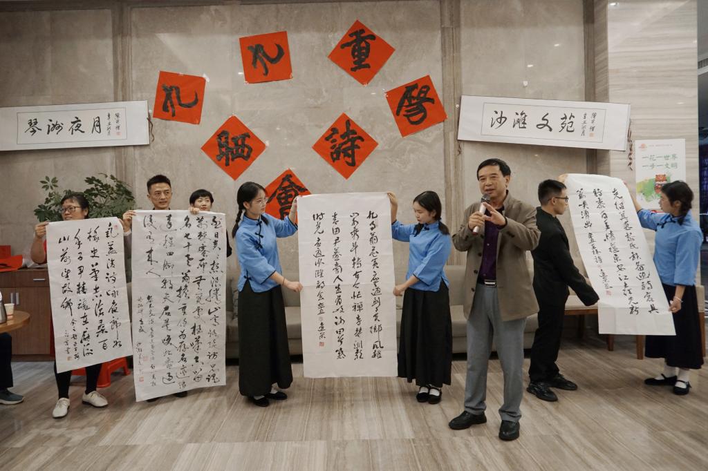 “莫谓三贤相去远,新章旧韵共秋风。”“更盼年年岁岁,文脉盛、诗意汪洋。”与会者或高歌低咏,或挥毫泼墨,在晒诗的同时表达了对沙滩文化的景仰之情。beat365亚洲版官网诗词楹联学会师生及校友30余人共提交诗词书法作品近百件,其中学生代表郑如意、杨兴旺、郑双贵等人表演的《沙滩秋韵》,以原创诗词联诵结合书法展示的形式赢得了大家的热烈掌声。学会会长、音韵学家雷昌蛟,学会顾问、文艺评论家王刚对晒出的诗词作品进行了精彩点评。晒诗会在全体人员《我和我的祖国》的歌声中圆满结束。