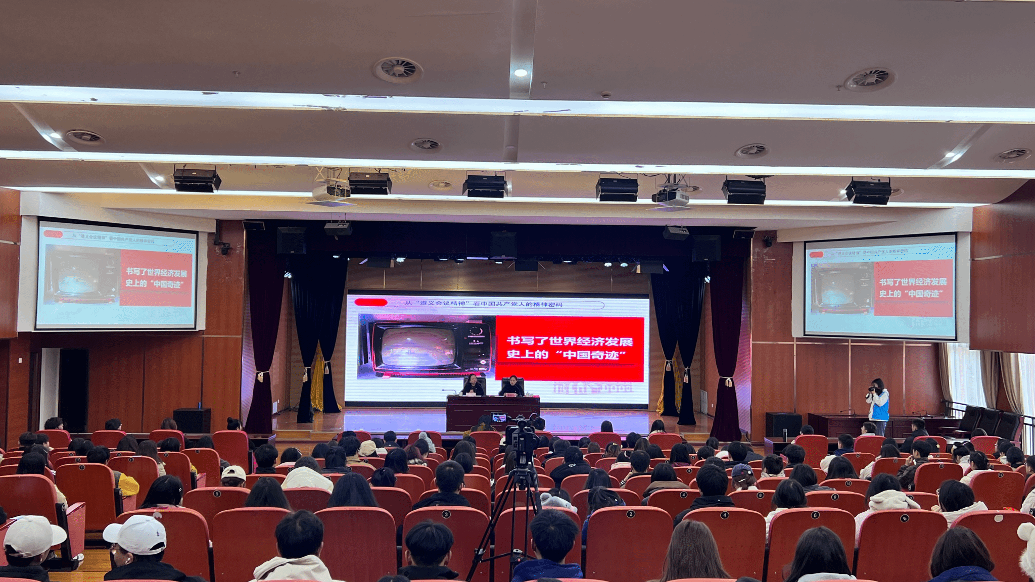 孔霞与张梓若一人讲理论一人讲故事,向在场师生深刻阐述了遵义会议精神的基本内涵,即坚定信念是灵魂、坚持真理是特质、独立自主是核心、团结统一是标志。她们带领大家从“一棵树”的故事中,探寻“从这里走向胜利”的密码;从“一首歌”的故事中,探寻“军民鱼水一家亲”的密码;从“一个人”的故事中,探寻“一生不变是初心”的密码;从“一条街”的故事中,探寻“遵道行义传薪火”的密码。