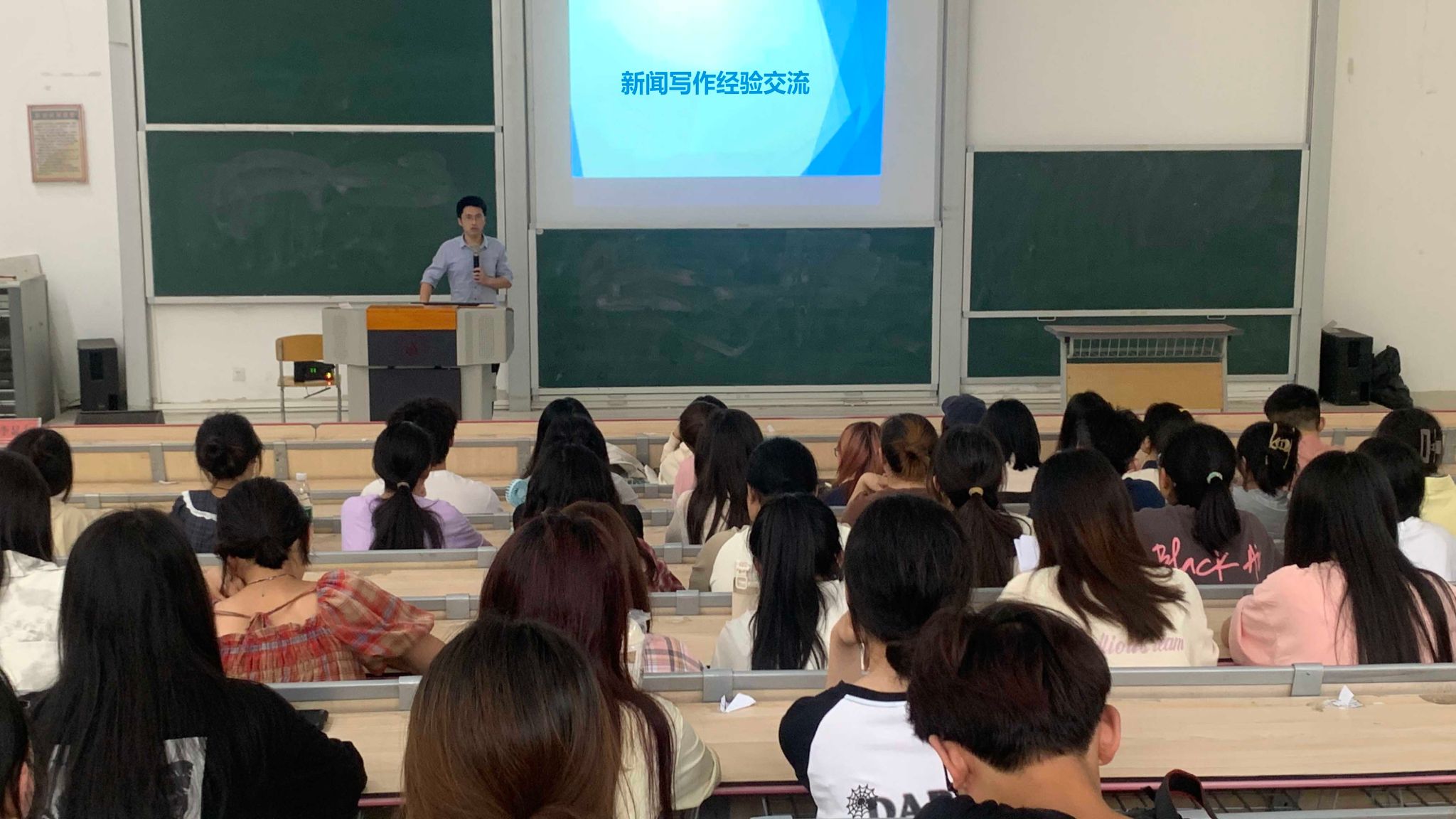 4月29日下午,党委宣传部教师伍景在执闳楼104教室与各单位教职工宣传联络员(新闻通讯员)、学生记者交流新闻写作经验,着重介绍了新闻最常用的体裁——消息。