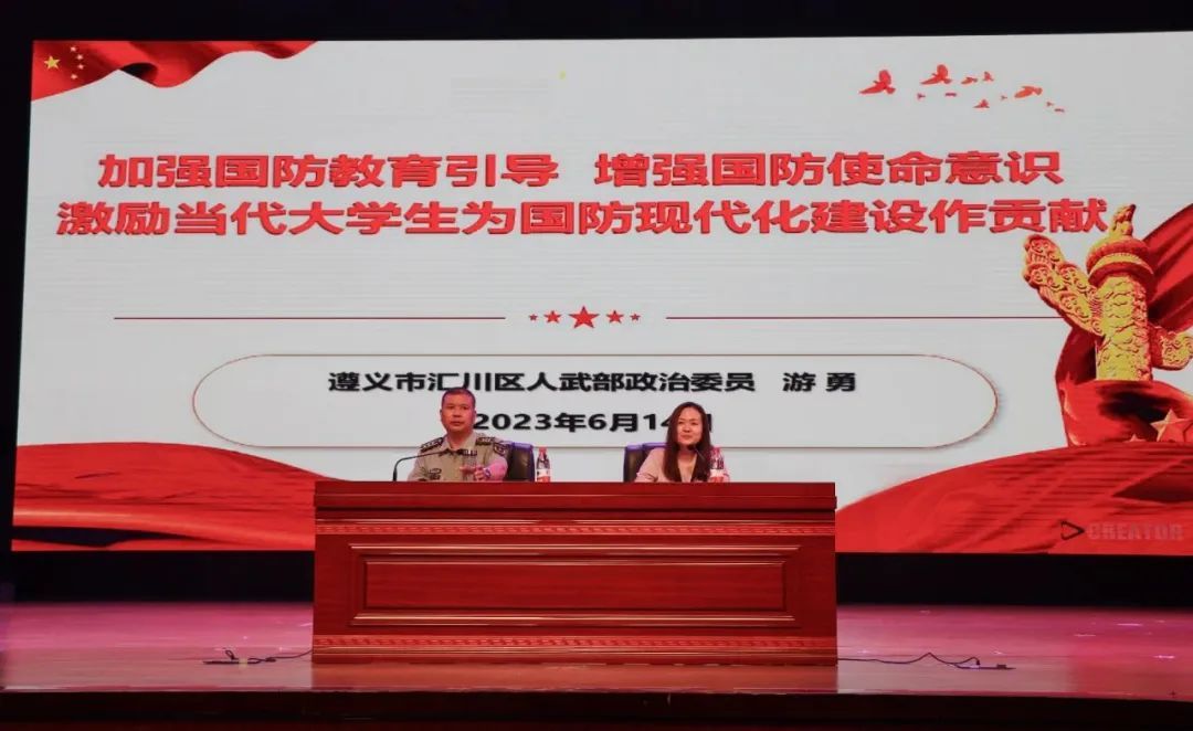 下午4时,游勇上校在beat365大礼堂为遵义职业技术学院、贵州航天职业技术学院和beat365预征兵班学生开展题为“加强国防教育培养 增强国防使命意识 激励当代大学生为国防现代化建设做贡献”的国防教育讲座,讲座由段佳部长主持。