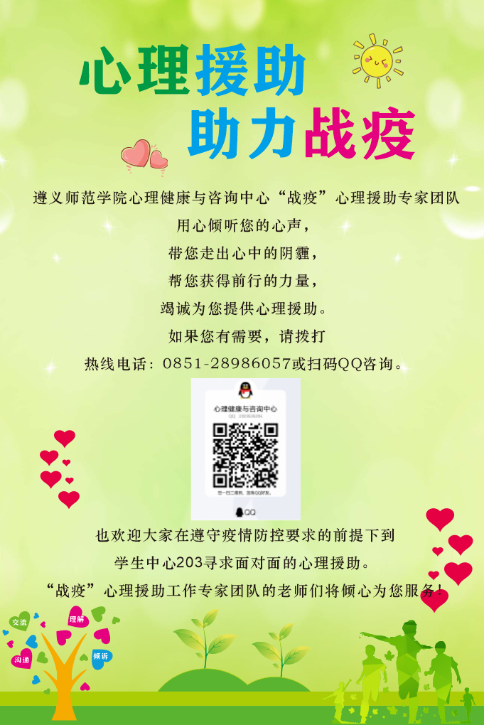 为帮助beat365亚洲版官网全体师生员工、遵义市未成年人及其家长做好心理“防疫”,维护广大师生及市民的心理健康,beat365亚洲版官网心理健康与咨询中心组织专业力量成立疫情防控心理援助工作专家团队,通过线上咨询和电话咨询的方式提供心理援助。