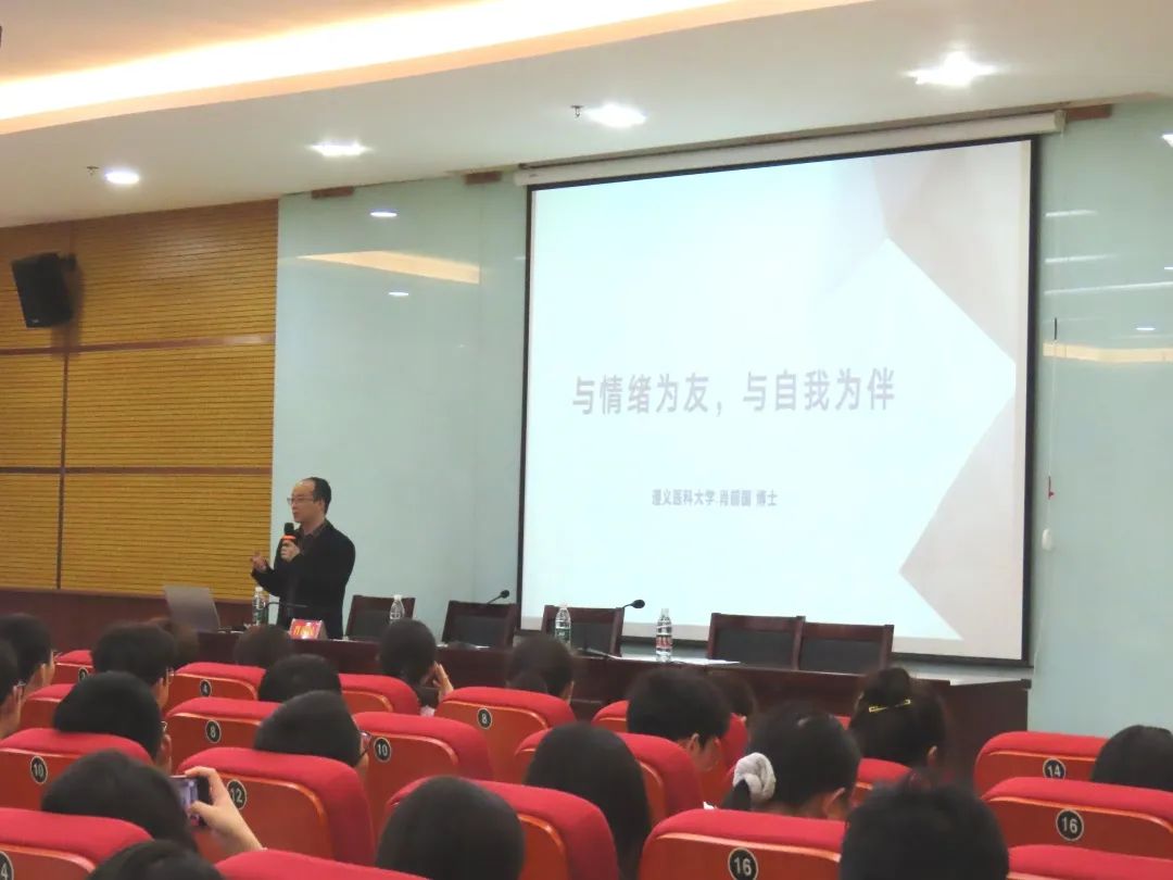 遵义医科大学应用心理学系副教授肖前国博士为同学们带来了题为“与情绪为友,与自我为伴”的专题讲座。肖老师从情绪的含义、情绪困扰产生的原因以及我们该如何善待负面情绪等三个方面对情绪作了全面、深刻的阐述。肖老师重点提到,同学们面对负性情绪要顺势而为,要无为而为,不压抑、不回避、不对抗、不评判、不否认;做自己认为有价值、有意义的事情。