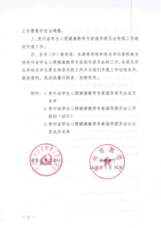 贵州省学生心理健康教育专家指导委员会是贵州省委教育工委、贵州省教育厅领导下的专家组织,接受贵州省委教育工委、贵州省教育厅的领导,对全省大中小学学生心理健康教育工作进行指导、咨询、督查和评估等。