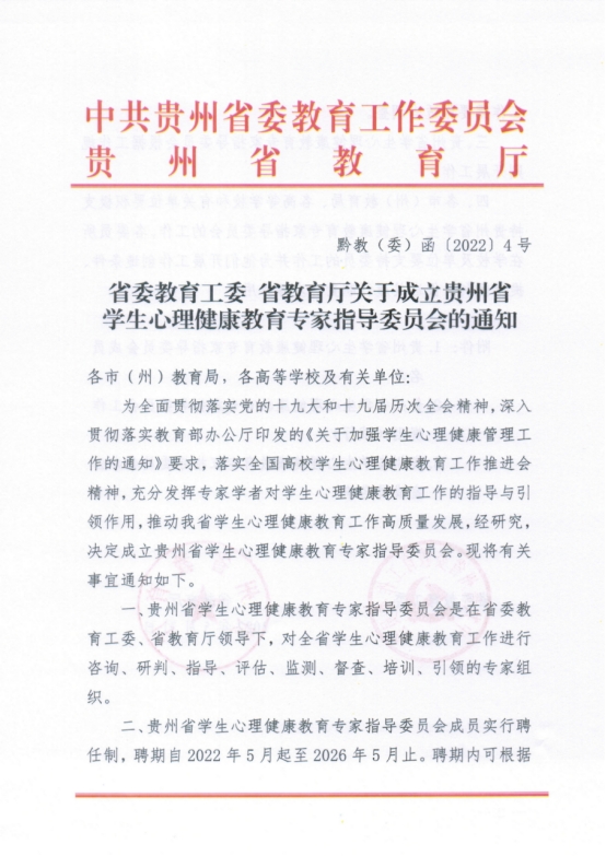 热烈祝贺朱海教授、周云教授成功入选为贵州省学生心理健康教育专家指导委员会委员