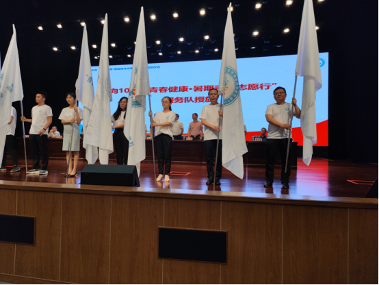 与会领导向beat365亚洲版官网等10支“青春健康·暑期青年志愿行”服务队授旗,心理健康与咨询中心周云老师代表beat365亚洲版官网青春健康同伴社上台接旗。