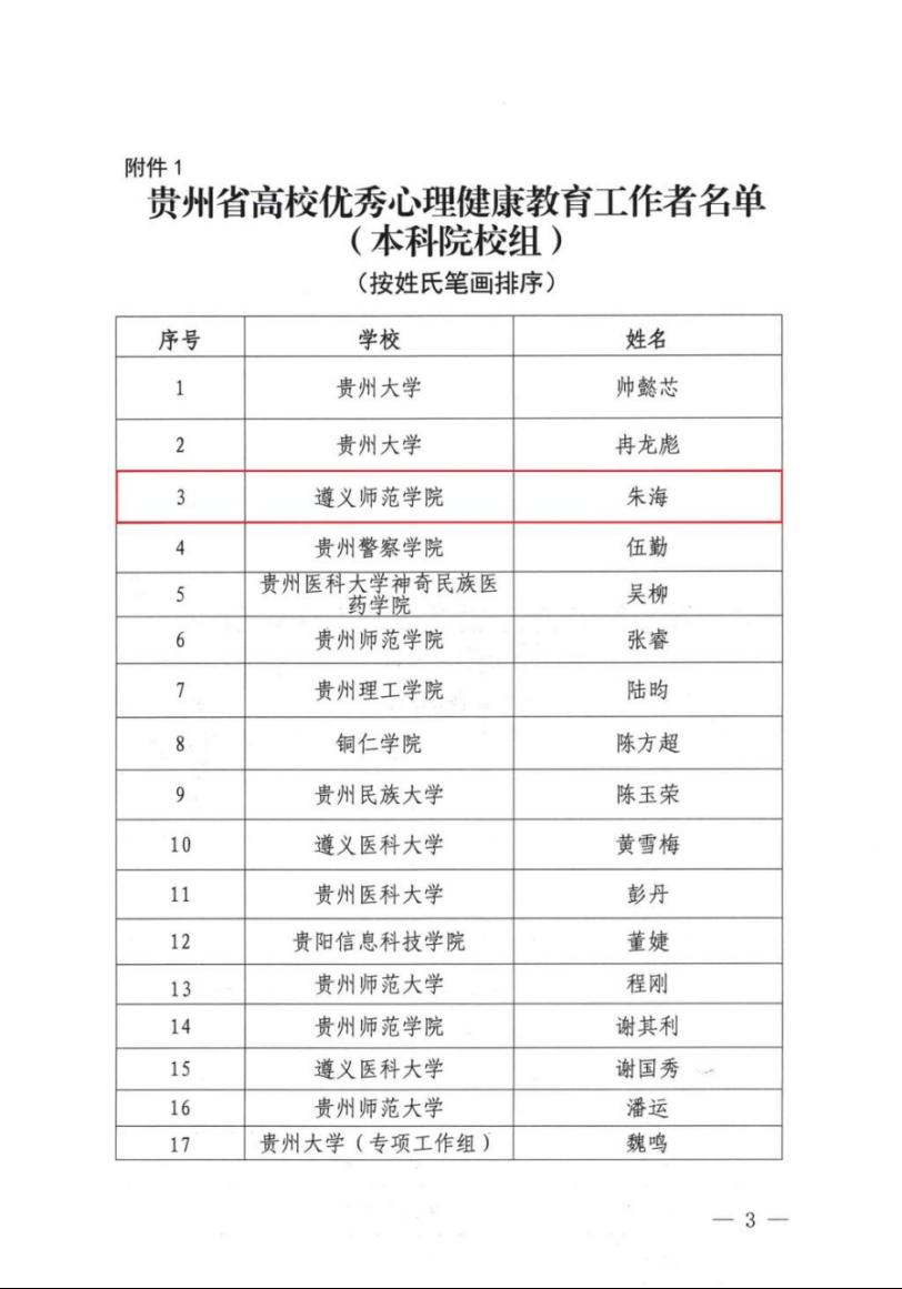 近日,省教育厅公布2022年度贵州省高校优秀心理健康教育工作者评选结果。经学校心理健康与咨询中心推荐、专家评审、结果公示,beat365亚洲版官网教师教育学院院长、beat365亚洲版官网心理健康与咨询中心负责人朱海教授获评“贵州省高校优秀心理健康教育工作者”。在此向朱海教授表示热烈祝贺!