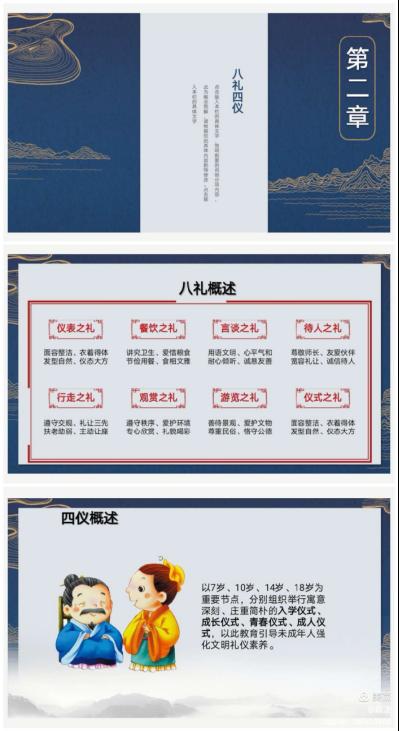 然后,张老师就八礼四仪(即仪表之礼、餐饮之礼、言谈之礼、待人之礼、行走之礼、观赏之礼、游览之礼、仪式之礼和入学仪式、成长仪式、青春仪式、成人仪式)进行了详尽而又生动的解说。