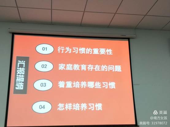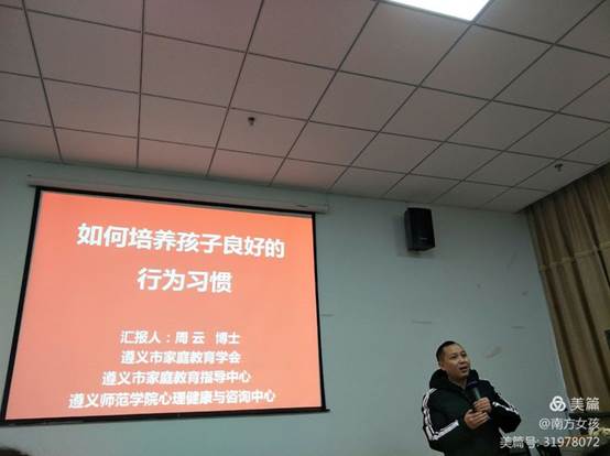周老师针对如何培养孩子良好的行为习惯,讲了四个方面的内容:行为习惯的重要性;家庭教育存在的问题;着重培养哪些习惯;怎样培养习惯。