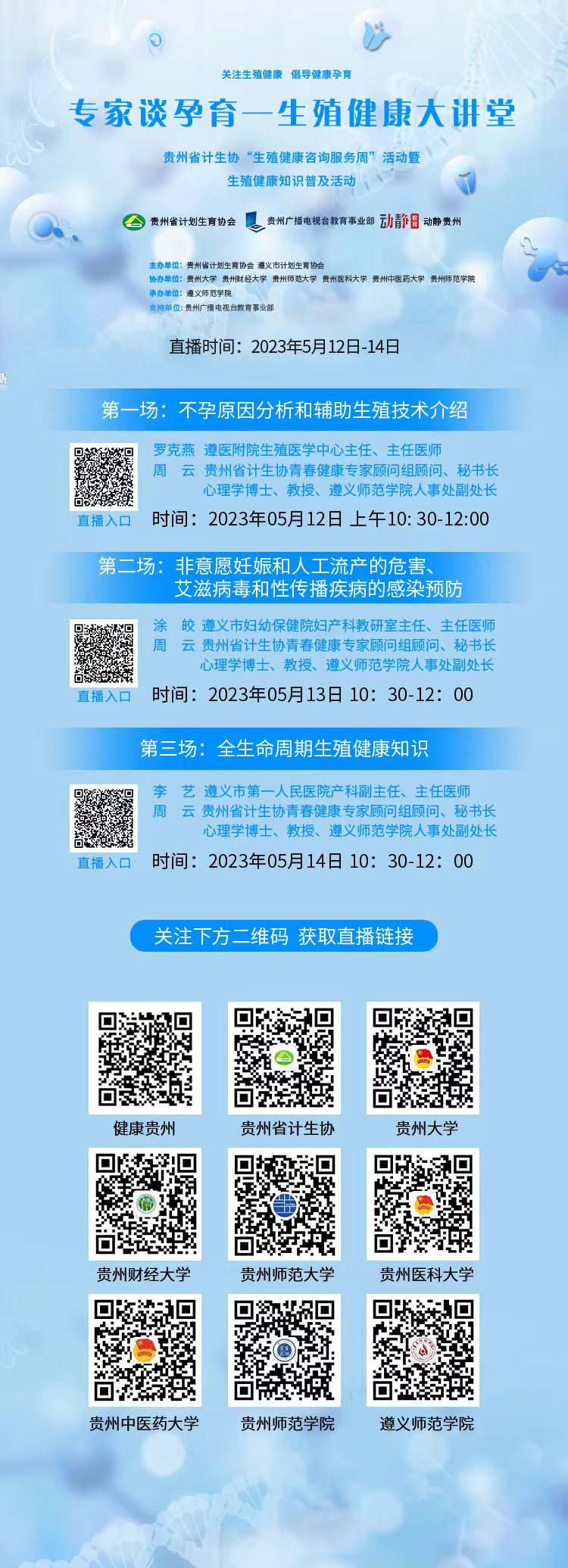 2023年5月12日至14日,由贵州省计划生育协会、遵义市计划生育协会主办,beat365亚洲版官网承办的“生殖健康咨询服务周”暨生殖健康知识普及活动《专家谈孕育—生殖健康大讲堂》网络直播节目在beat365亚洲版官网长征讲堂顺利举行。
