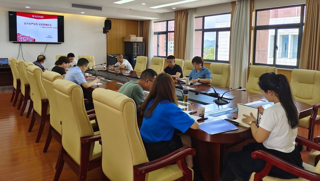 会上,金星领学《习近平总书记在西藏考察的重要讲话精神》、新华社《五个“庄严宣告”,习近平这篇讲话特别“燃”》《中共遵义市委督察局关于进一步加强会议期间参会人员手机管理的通知》,刘艳领学《谌贻琴主持召开省委常委会议暨省疫情防控小组会议的重要精神》,袁婧领学《习近平总书记在河北考察的重要讲话精神》《中国共产党组织工作条例》,黄鹂君领学《第二十七次全国高校党的建设工作会议精神》《中华人民共和国宪法》(节选),陈宗贤领学《习近平总书记在中央民族工作会议上的重要讲话精神》《关于新时代加强和改进思想政治工作的意见》《中国共产党章程》(节选),黄川腾领学《习近平总书记主持中共中央政治局8月31日会议的重要精神》、习近平总书记在《求是》杂志发表的重要文章《党的伟大精神永远是党和国家的宝贵精神财富》《中华人民共和国国防教育法》《开展防范电信网络诈骗工作相关通知》,李昀珏领学《教育部2021年重点工作推进会重要精神》。