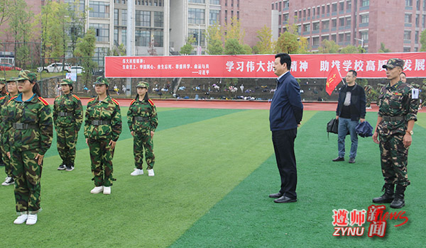 运动场上,各连队正迎着蒙蒙细雨训练,正步走、军体拳、数字方阵……他们动作规范,步调整齐,口号响亮,展现出遵师学子自强不息的精神风貌。