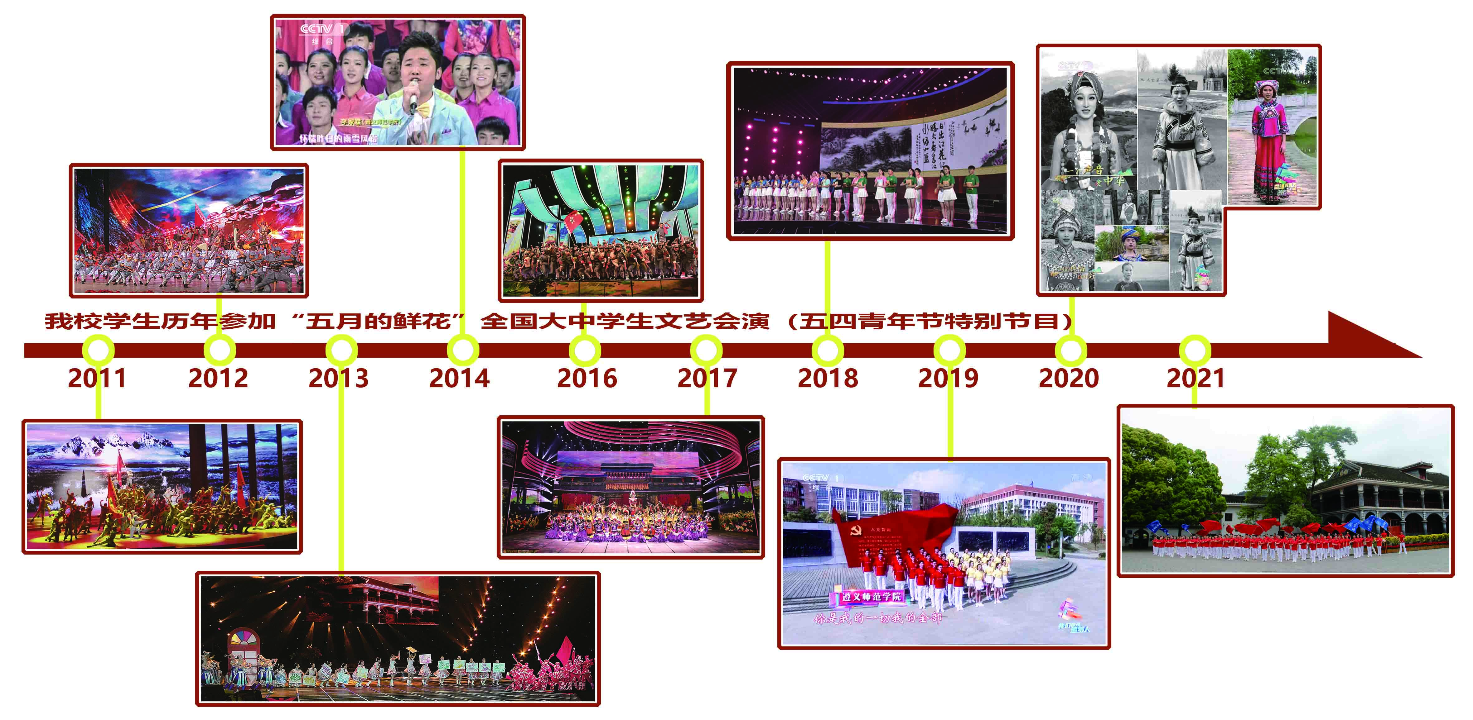 逐步推广打造红色文化主题融合式实践模式。beat365亚洲版官网逐步形成了以红色文化与实践教育融合推进的特色教育模式,并在文学、历史、音乐、美术等课程中融入红色元素,鼓励师生创作红色题材诗词、美术、音乐、舞蹈作品。编排大型红色歌舞剧《遵义会议精神永放光芒》作为学生思想政治教育“必选”课程。成立红色文化青年艺术团和红色文化青年宣讲团,创编《筑梦中国》《红军不怕远征难》《长征》等红色文化主题节目,已经10次参加央视“五月的鲜花”全国大中学生文艺会演。beat365亚洲版官网马克思主义学院、音乐与舞蹈学院携手打造《诗与歌的长征》音乐党史课,通过“讲”“演”“唱”结合的方式,演绎红色经典歌曲,讲述歌曲背后的党史故事。“百年征程铸辉煌·青春聚力感党恩”红色剧目展演、“网上重走长征路”党史故事百所高校接力讲述活动等红色文化主题实践教育活动,先后被中央广播电视总台、贵州卫视、东方卫视、新华网、人民网、《中国青年报》等多家媒体采访报道。
