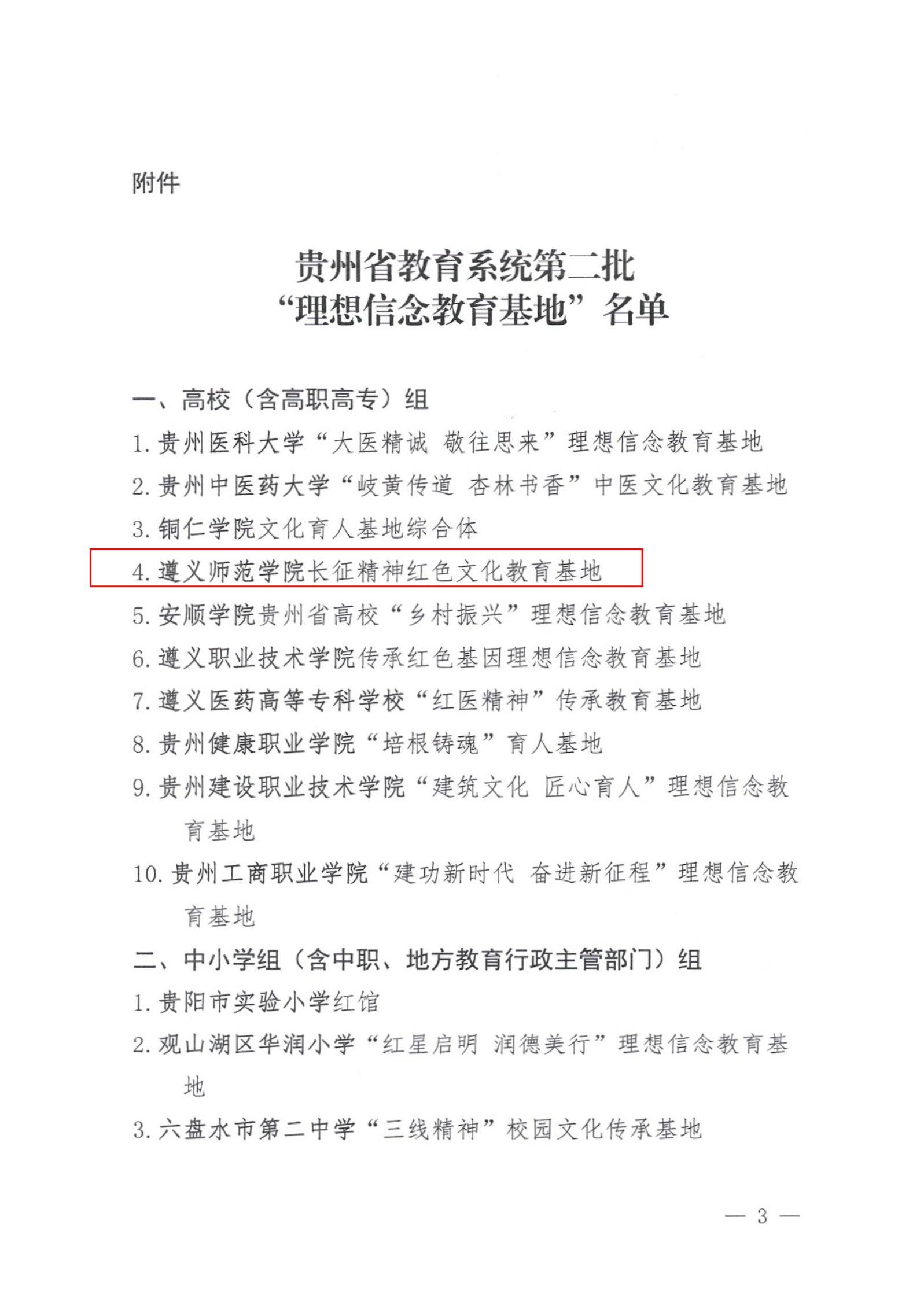 近日,学校党委宣传部与马克思主义学院、长征文化研究院共同申报的“beat365亚洲版官网长征精神红色文化教育基地”获批为贵州省教育系统第二批“理想信念教育基地”。