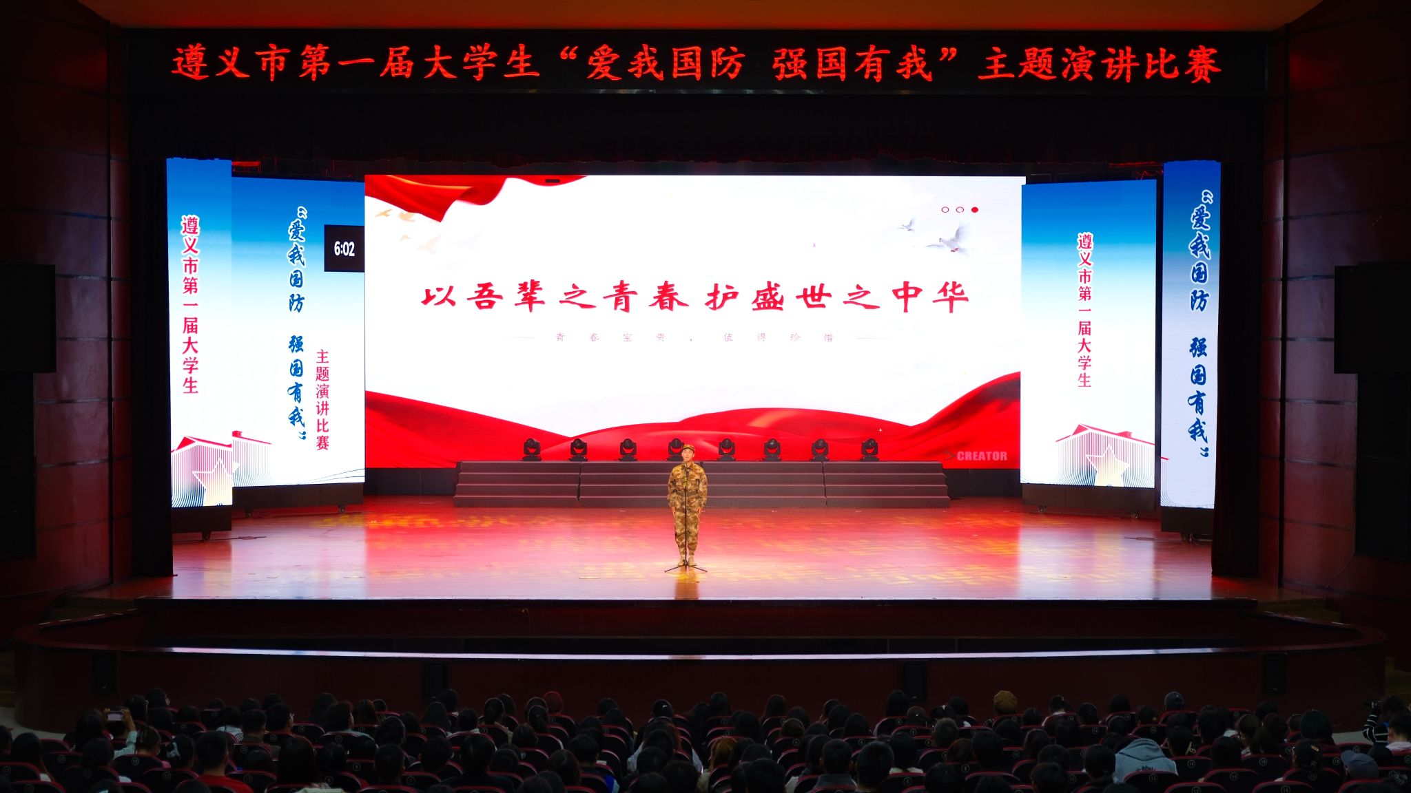 比赛中,选手们绘声绘色、慷慨激昂,紧紧围绕“爱我国防,强国有我”主题,以《国防有力量,民族有希望》《建设国防,铸就和平之剑》《筑少年之国防梦,圆民安之中国梦》等为题,从传承红色基因、弘扬革命精神,到坚定强军报国志,再到提升全民国防意识,尽情诠释自己对国防的理解,抒发尊重崇尚英雄、矢志报国强军的豪情壮志,展示了遵义大学生的爱国心、国防志和蓬勃向上的青春风貌,不时赢得台下阵阵掌声,现场气氛热烈。
