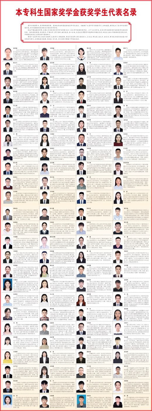 经过严格选拔和评审,全国6万名优秀本专科学生荣获2019—2020学年度国家奖学金。以上100名学生,是本专科生国家奖学金获奖学生的优秀代表。他们爱党爱国、信念坚定,严谨求学、勇于创新,诚信友善、热心公益,矢志成为勇攀学术高峰的不懈追求者、社会主义核心价值观的忠实践行者、中国特色社会主义事业的可靠接班人。