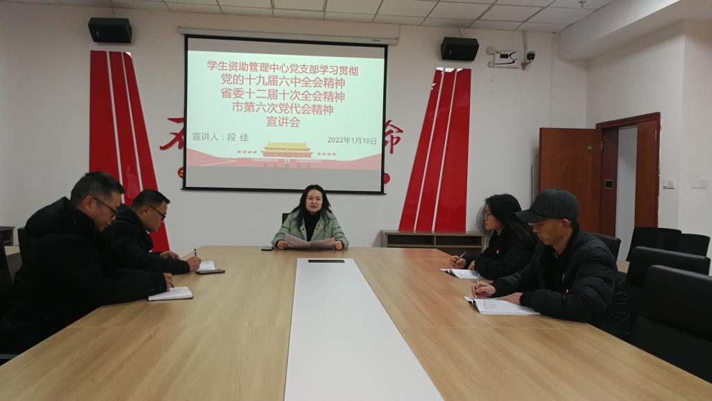 2022年1月10日上午,学生资助管理中心党支部在学生中心419会议室组织开展学习贯彻党的十九届六中全会精神、省委十二届十次全会精神和市第六次党代会精神宣讲会,学生资助管理中心支部全部党员同志参加,非党员杨静同志列席。