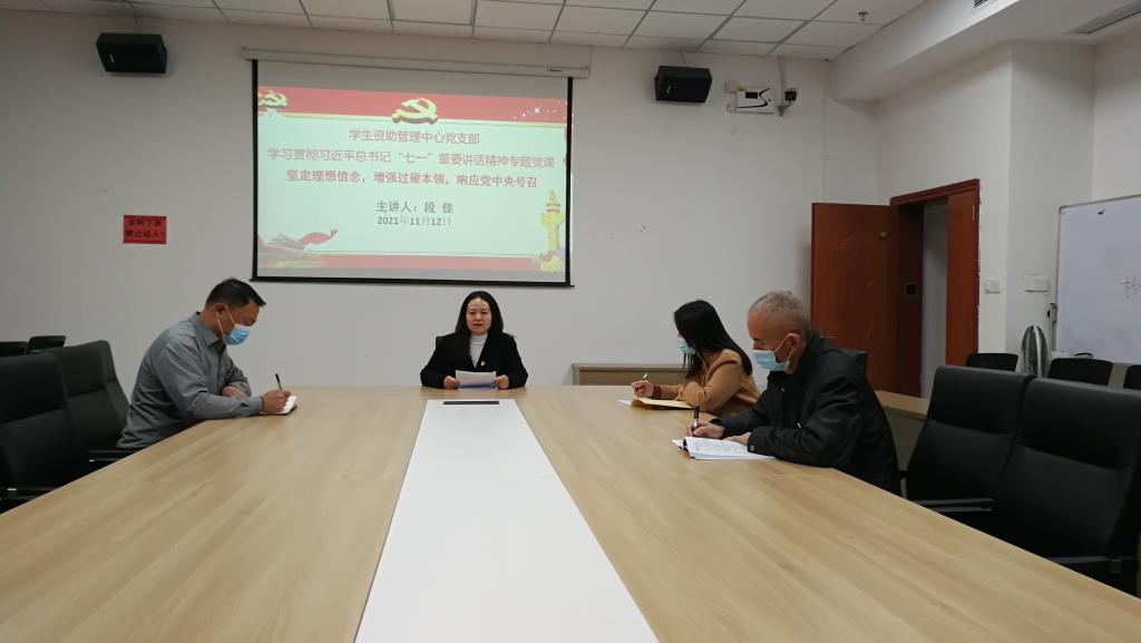 2021年11月12日上午,学生资助管理中心党支部在学生中心419会议室开展学习习近平总书记“七一”重要讲话精神专题党课,支部书记段佳主讲,全体党员参加。