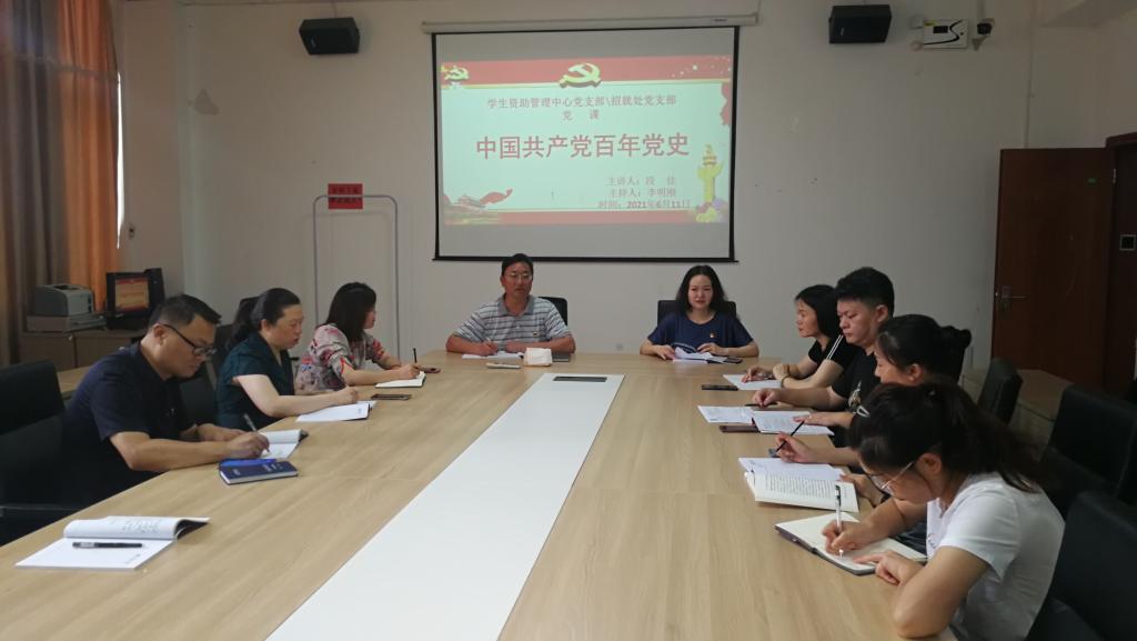 2021年6月11日上午九点,学生资助管理中心党支部和招生与毕业就业指导处党支部在学生中心419会议室开展党史学习教育暨“牢记殷切嘱托、忠诚干净担当、喜迎建党百年”专题党课,学生资助管理中心支部书记段佳主讲,招生与毕业就业指导处支部书记李明刚主持,学生资助管理中心党支部和招生与毕业就业指导处党支部全体党员、非党员参加。